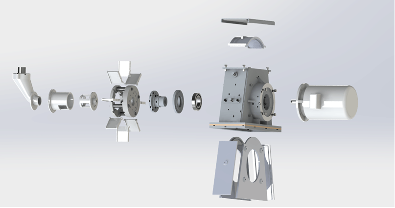 TFQ034型高效抛丸器,它由叶轮、叶片、分丸轮、定向套、导入管、护板、护罩、特种电机等组成。弹丸由导入管流入分丸轮中,预加速后经定向套口抛出,由叶片继续对其加速进而高速抛射达到工件表面进行强力打击,以达到清理之目的