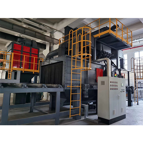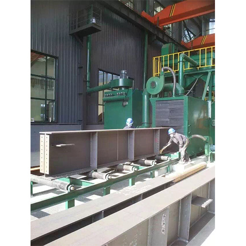 钢结构抛丸机能连续不间断工作,对各类钢材,如钢板,钢材,钢梁,型钢,钢管和铸钢件等以一种连续通过方式进行除氧化皮,清理和预处理。清理过程中由可调速输送辊道将钢结构件或钢材送进清理室内抛射区。其周身各面受到来自不同坐标方位的强力密集弹丸打击与摩擦。使其上的氧化皮,锈层及其污物迅速脱落。钢材表面就获得一定的粗糙度的光洁表面。在清理室外两边进出口辊道装卸工件。落入钢材上面的弹丸与锈尘经吹扫装置吹扫。