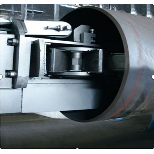 内壁抛丸小车在在横梁上进行抛丸的同时,也在横梁上行走,行走是变频调速的。被打完的塔筒表面呈现一定宽度宽的环形螺旋状的银白色条带,将小车的行走速度与塔筒的转速进行相配合。此次相邻的银白条带相互重合。可以使塔筒表面无任何遗漏。钢管打砂的方式可以改变为:在打砂的过程中。打车小车不同时移动,打完一圈后,在移动一个工作位置,再打一圈,直至将钢管内壁打完。