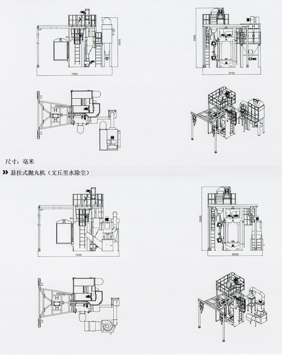 待抛丸的工件直接挂在吊钩或吊架上,人工带到抛丸室前部的牵引系统,吊钩自动进入抛丸室。